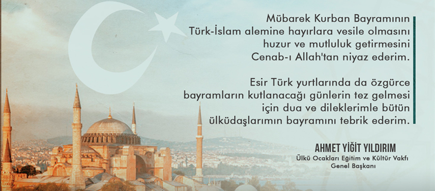 Ülkü Ocakları Genel Başkanı Sayın Ahmet Yiğit Yıldırım sosyal medyada yayınladığı mesajla tüm islam aleminin Kurban Bayramı’nı kutladı. Genel Başkan Ahmet Yiğit Yıldırım mesajında “Mübarek Kurban Bayramının, Türk-İslam alemine hayırlara vesile olmasını huzur ve mutluluk getirmesini Cenab-ı Allah'tan niyaz ederim. Esir Türk yurtlarında da özgürce bayramların kutlanacağı günlerin tez gelmesi için dua, dileklerimle bütün ülküdaşlarımın bayramını tebrik ederim” sözlerine yer verdi.
