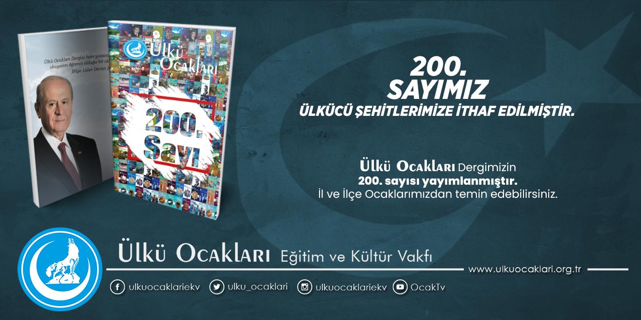 Ülkü Ocakları Dergimizin 200.sayısı yayımlanmıştır. Bu özel sayımız, Yüce Türk milleti ebediyete kadar yaşasın diye can ve kan veren Ülkücü Şehitlerimizin aziz hatıralarına ithaf edilmiştir. Rabbim daha nice 200. sayılara ulaştırmayı nasip ve müyesser eylesin. İyi okumalar dileriz.
